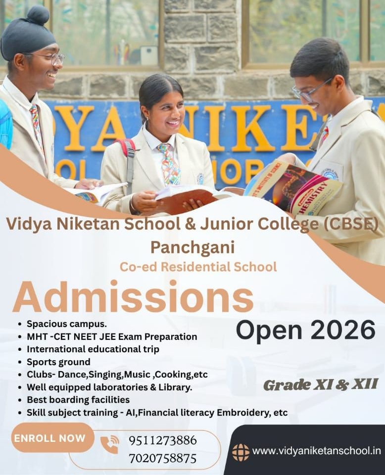 Vidya Niketan School & Jr. College CBSE Enquiry Form Day Scholar Boarder Full Name Enquiry for Class I II III IV V VI VII VIII IX X XI COM XII COM XI SCI XII SCI City State Country Pincode Phone No. Mobile Email Subject : Enquiry Postal Address Information you Need Reset Submit Address:Near Sydney Point , Main Road, Panchgani Opens in a new tabPhone:+91 9511273886Opens in your applicationMobile:+91 9511273886Opens in your applicationWebsite:https://vidyaniketanschool.inOpens in a new tab